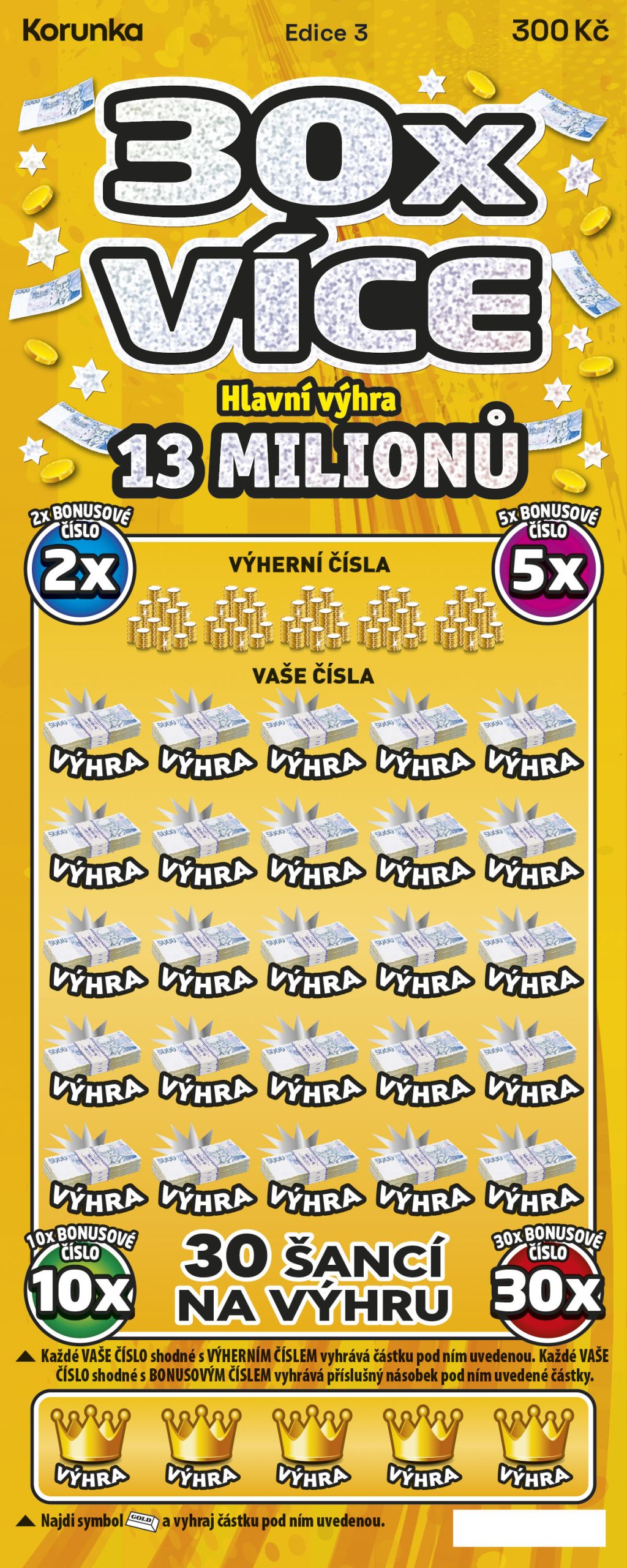 2. V prvním herním poli je po setření 5 VÝHERNÍCH ČÍSEL, 25 VAŠICH ČÍSEL a 4 BONUSOVÁ ČÍSLA. Každé z VAŠICH ČÍSEL, které se shoduje s některým VÝHERNÍM ČÍSLEM, vyhrává výhru pod ním uvedenou. Každé VAŠE ČÍSLO shodné s některým BONUSOVÝM ČÍSLEM vyhrává výhru ve výši, která je součinem násobku, který je uveden u příslušného BONUSOVÉHO ČÍSLA a peněžní částky uvedené pod příslušným VAŠÍM ČÍSLEM.